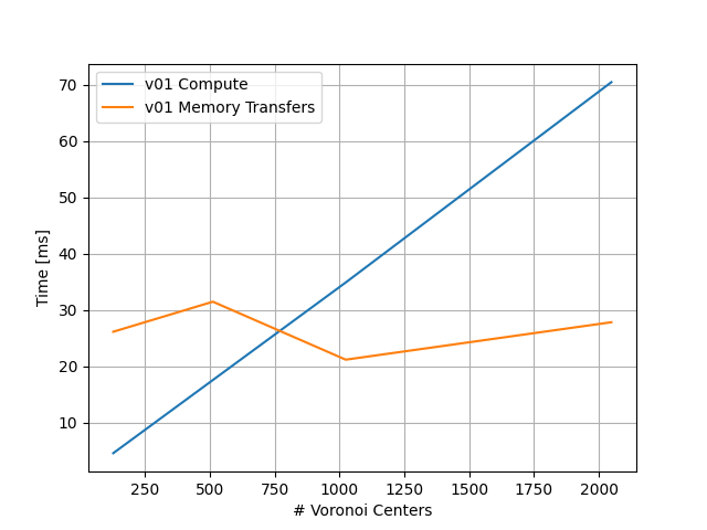 Memory transfer is largely determined by getting the map from the GPU but seems to vary a bit (perhaps because the very same GPU was controlling my screen at the same time). Compute time is the most linear graph I could have possibly asked for: The more Voronoi sites we have, the longer it takes for each map position to scan through all of them to find the closest one. Not inherently surprising, but makes you wonder whether that is necessarily the case. After all, most sites are pretty far away from a given point.